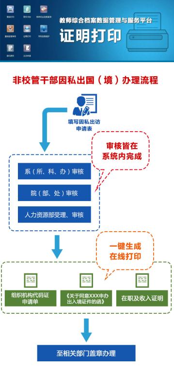 为简化办事流程,用心服务师生,实现以人为本、绿色高效的行政服务,人力资源部与信息中心在教师综合档案与服务平台开发完成教师因私出国、在职证明、收入证明业务在线办理、网上打印等服务功能。现对《教师因私出国办理流程》《教师在职与收入证明在线打印流程》进行图解,即日起,校内教职工因私出国、在职与收入证明打印等均登录教师平台进行网上申报。